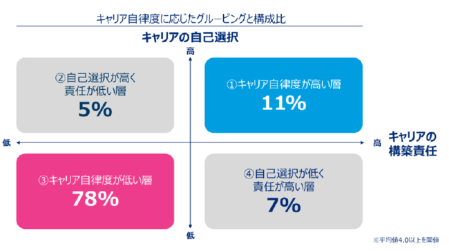 キャリア自律度が高い層(キャリアを自己選択し、キャリアの構築を自身の責任と考える人材)の割合は11%にとどまる