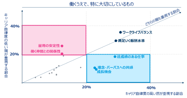 キャリア自律が高い層を惹きつける上では、理念・パーパスへの共感や達成感のある仕事と成長機会が有効