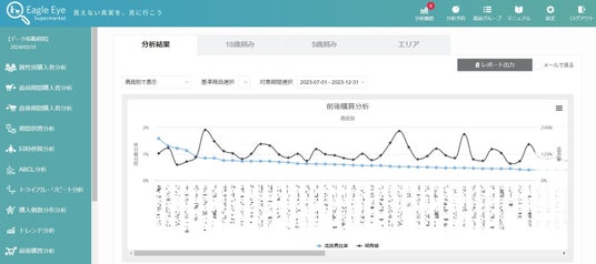 「Eagle Eye」とは、全国のドラッグストアや食品スーパーマーケットにおける購買情報を統計化し、消費者の購買行動をID-POSデータ(顧客ID付き購買データ)※で分析できるSaaS型ツールです。今回、新たにオプションメニューとして「前後購買分析」を追加したほか、既存メニューの仕様を変更することで分析機能を強化し、消費者の購買行動をよりリアルに把握することが可能になりました。