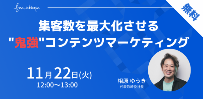株式会社free web hope(本社:東京都千代田区、代表取締役:相原ゆうき)は、無料のオンラインセミナー「集客数を最大化させる"鬼強"コンテンツマーケティング」を11月22日(火)に開催いたします。(お申込みフォーム: