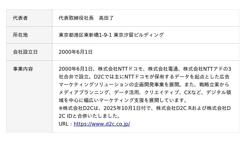 株式会社D2C(以下、D2C)、株式会社NTTドコモ(以下、ドコモ)、株式会社電通(以下、電通)は、企業のプロモーション施策を支援するマーケティングソリューション「MJ SCORE (TM)(Microcosm of Japan SCORE )」(※1)(以下、本ソリューション)を共同開発しました。本ソリューションは、2025年12月3日(水)から電通より提供を開始します。