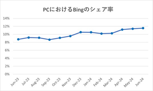 調査結果サマリー ■ PCにおける「Microsoft Bing」のシェアが微増 全世界で見ると、Microsoft Bingのシェア率が若干ながらも上がっている傾向が見られました(以下グラフ参照)。その背景としては、2023年2月に公開された「Bing AI(現 Copilot(コパイロット))」がリリースされたこと、さらに2021年10月にリリースされたWindows11において、デフォルトで
