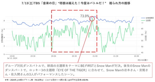最も注視されたのは、グループ対抗バトルでSnow Manの岩本照さん・宮舘涼太さん・佐久間大介さんがパフォーマンスしたシーンで注目度は73.9%。プライム帯の平均を15%も超える高い注目度を獲得しました。最近はドラマやバラエティでの活躍が目立つSnow Manですが、対戦相手のBE:FIRSTに引けを取らない、エンターテイメント性溢れる演技を披露したことで視聴者をくぎづけに。SNSでも賞賛の声が相次ぎました。