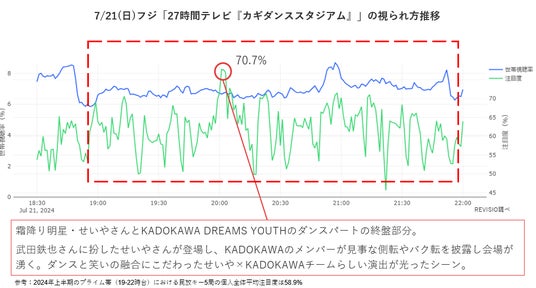 18:50頃から始まった同企画の中で、最も視聴者がくぎづけになったのは20:01。霜降り明星・せいやさんがKADOKAWA DREAMS YOUTHとのコラボダンスを披露したシーンでした。個人全体注目度は70.7%で、こちらも「音楽の日」同様プライム帯の平均を大きく超える注目度をたたき出しました。
