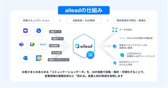 商談・面談データ解析クラウド ailead(エーアイリード)は、“営業・人事部長の右腕”として、業務効率化と人材育成を通じた生産性向上を支援するツールです。