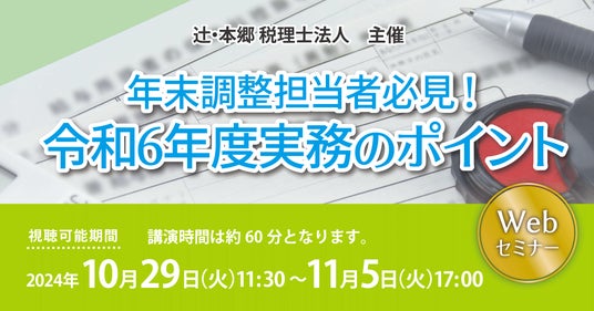 辻・本郷 税理士法人(本社:東京都新宿区、理事長:徳田孝司)は、「年末調整担当者必見! 令和6年度実務のポイント 」セミナーを開催いたします。年末調整の基礎を、申告書を確認しながら実務者の目線で解説するセミナーです。給与所得税の計算方法や源泉徴収票のほかに、定額減税について気を付けるべきポイント等、複雑化する年末調整を社会保険労務士がわかりやすく説明します。