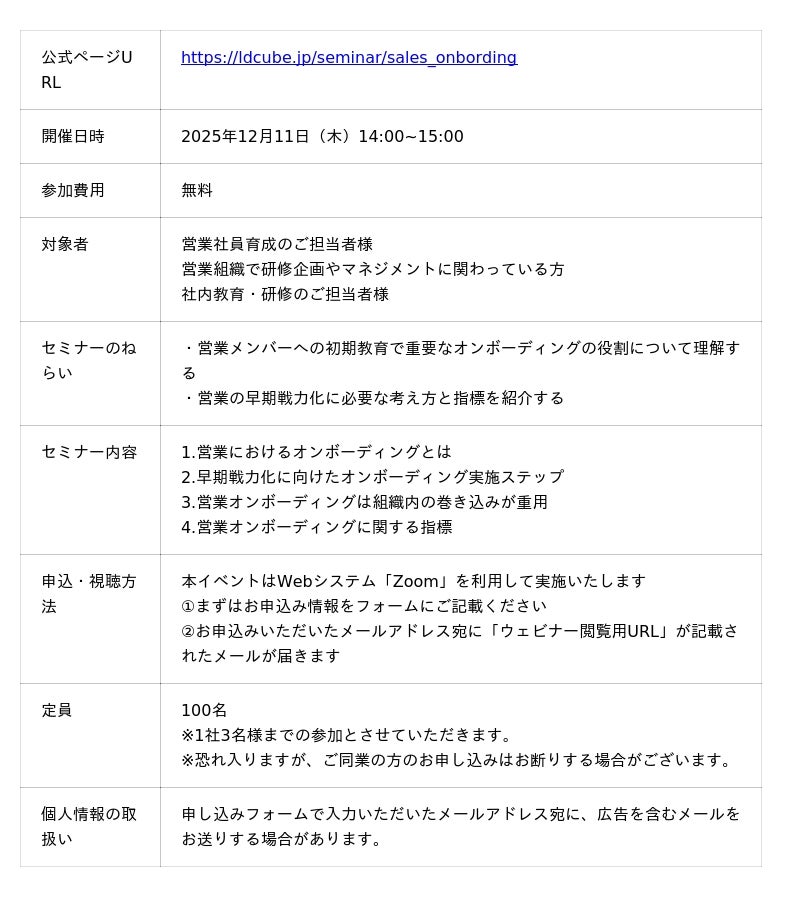 研修のスタイルにとらわれない企業向け人材育成サービスを提供する株式会社LDcube(本社:東京都千代田区、代表取締役社長:新井澄人、以下「当社」)は、「【営業の早期戦力化】営業メンバーへの入社初期教育の効率化とは ~デジタルツール活用法も紹介~」と題してウェビナーを開催しますので、お知らせします。