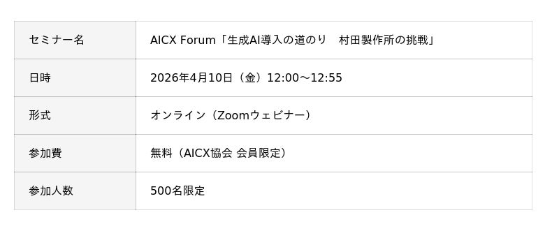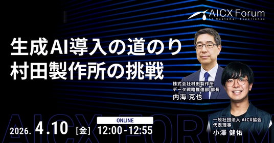 一般社団法人AICX協会(東京都、代表理事:小栗 伸/小澤 健祐、以下、AICX協会)は、2026年4月10日(金)12:00~12:55、AICX Forum「生成AI導入の道のり 村田製作所の挑戦」を開催します。
