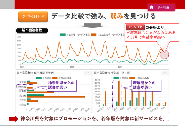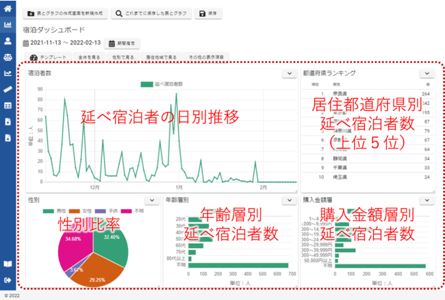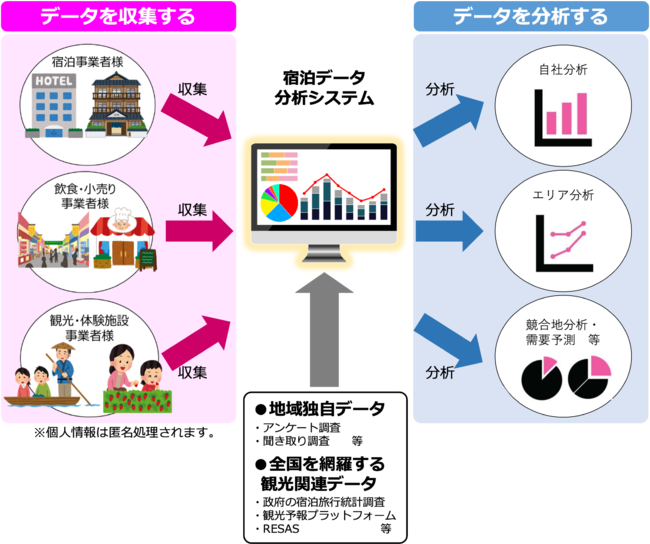 観光DXプラットフォームサービスでは、データを収集及び分析を行う「宿泊データ分析システム」を用い、