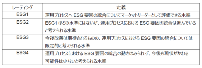 運用商品の運用プロセスにおけるESG要因の統合の度合いを評価しています。以下の表のように、1から4の4段階のレーティングとして表示され、1が最も高く、4が最も低い評価となります。