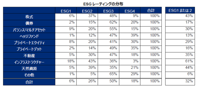 マーサーは2008年から運用商品のESG要因を運用プロセスに組み入れている度合いを、グローバルに221名が配置されているリサーチャーが評価し、ESGレーティングを付与しています。ESGレーティングは1から4の4段階で表示し、1が最も高く、4が最も低い評価となります。2022年12月時点では、6,002の運用商品にレーティングを付与しています。相対的に評価の高いESG1またはESG2が付与されている運用商品の割合は全体では32%となっており、資産別ではインフラストラクチャー、天然資源、株式、不動産においてこれらの比率が高くなっています。