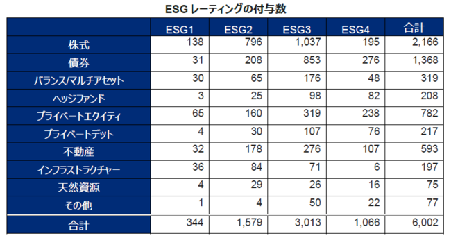 2022年12月時点における、ESGレーティングの付与数と分布は、以下の表の通りです。