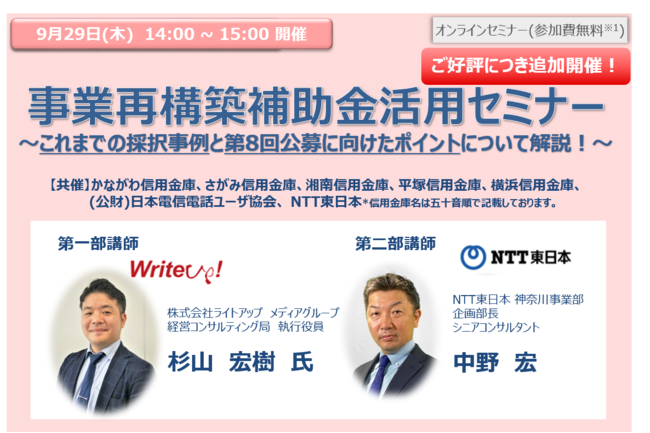 NTT東日本 神奈川事業部は、かながわ信用金庫、さがみ信用金庫、湘南信用金庫、平塚信用金庫、横浜信用金庫、日本電信電話ユーザ協会と共に、事業再構築補助金活用セミナーを開催します。