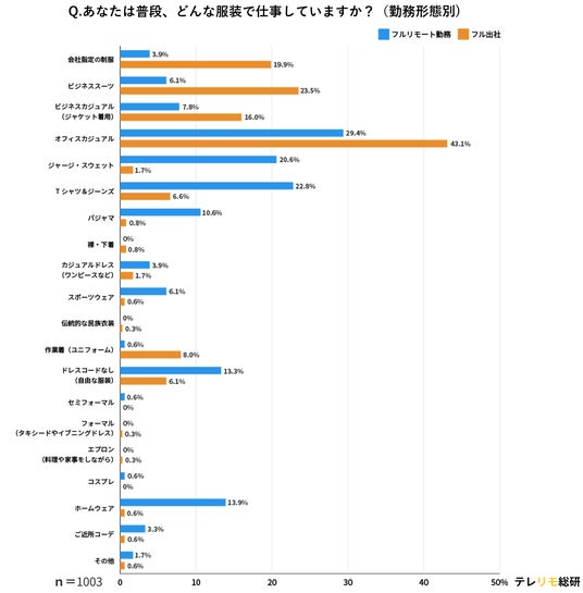 一方でフルリモート勤務者でも、「ビジネススーツ(6.1%)」「会社指定の制服(3.9%)」と回答された方がいる様子。
