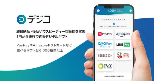 https://digi-co.net/ )は、初期費用・月額費用無料で、PayPay、Amazonギフトカード、QUOカードPay、LINE Pay、nanacoギフト、WAONポイントID、Apple Gift Card、Google Play ギフトコード、PeXポイントギフトなどに交換可能なデジタルギフトサービスです。1円単位1枚から当日発行することが可能です。いつでもすぐに必要な分だけ発行することができるため、企業の広告予算の調整や急なキャンペーンの実施などにも柔軟に対応することができ、当日まで人数把握が難しいイベントの謝礼などにも幅広く活用することが可能です。