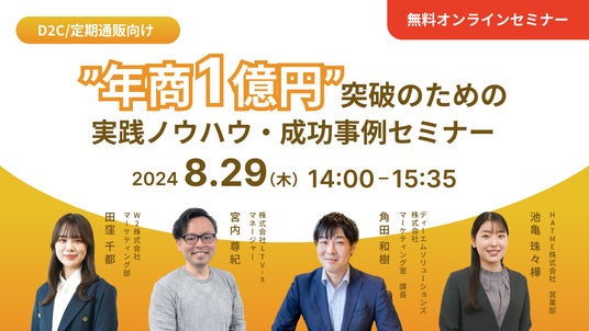 マーケティングアソシエーション株式会社の子会社であるHATME株式会社(本社:東京都台東区 代表取締役:中園広和、以下当社)は2024年8月29日(木)に、ウェブセミナー「【D2C/定期通販向け】”年商1億円”突破のための実践ノウハウ・成功事例セミナー」を、W2株式会社、株式会社LTV-X、ディーエムソリューションズ株式会社と共催いたします。