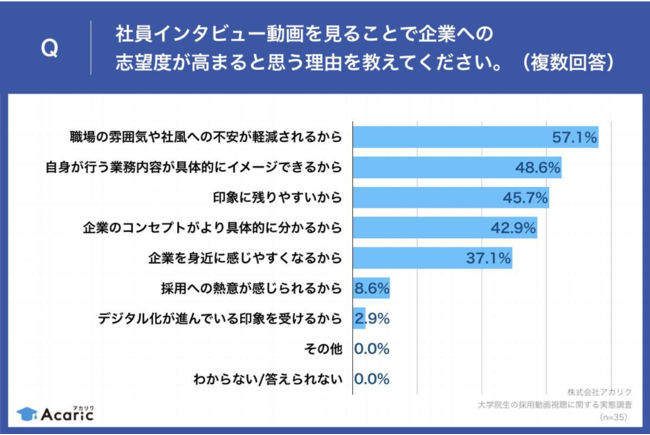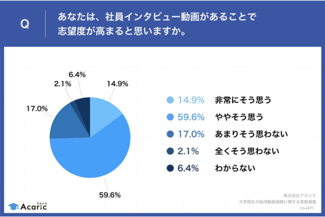 更に、74.5%の就活生が、「社員インタビュー動画があることで志望度が高まる」と回答。「職場の雰囲気や社風への不安が軽減される」、「自身が行う業務内容が具体的にイメージできる」などの声も集まっています。