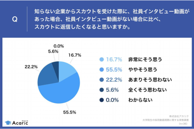 また、知らない企業からスカウトを受けた際に、社員インタビュー動画があった場合、社員インタビュー動画がない場合に比べ、「スカウトに返信したくなる」と回答した大学院生就活生は72.3%にのぼり、その理由として、約7割から「短時間でより多くの情報が収集できるから」、5割強から「企業の雰囲気を掴みやすいから」という声が挙がっています。