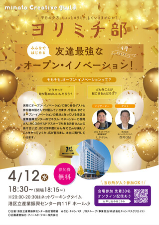 港区立産業振興センター(所在地:東京都港区)では、4月12日にヨリミチ部 4月部会!「みんなで始める友達最強なオープン・イノベーション!」を開催いたします。