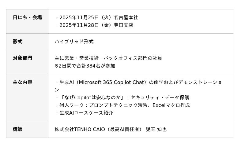 特に本プログラムでは、Microsoft 365 Copilot Chatを安全に使い始めるための心理的ハードルを下げるとともに、実務で活かせる知識やスキルの習得に重点を置きました。