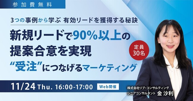 株式会社リブ・コンサルティング(本社:東京都千代田区、代表取締役:関 厳)は、成功事例から有効リードを獲得する秘訣を導き出す「新規リードで90%以上の提案合意を実現 “受注”に繋げるマーケティング」オンラインセミナーを2022年11月24日(火)に開催いたします。