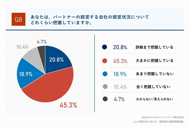 「Q8.あなたは、パートナーの経営する会社の経営状況についてどれくらい把握していますか。」(n=106)と質問したところ、「詳細まで把握している」が20.8%、「大まかに把握している」が45.3%という回答となりました。