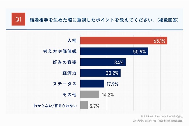 「Q1.結婚相手を決めた際に重視したポイントを教えてください。(複数回答)」(n=106)と質問したところ、「人柄」が65.1%、「考え方や価値観」が50.9%、「好みの容姿」が34.0%という回答となりました。