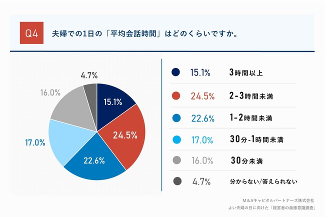 「Q4.夫婦での1日の「平均会話時間」はどのくらいですか。」(n=106)と質問したところ、「2~3時間未満」が24.5%、「1~2時間未満」が22.6%、という回答となりました。