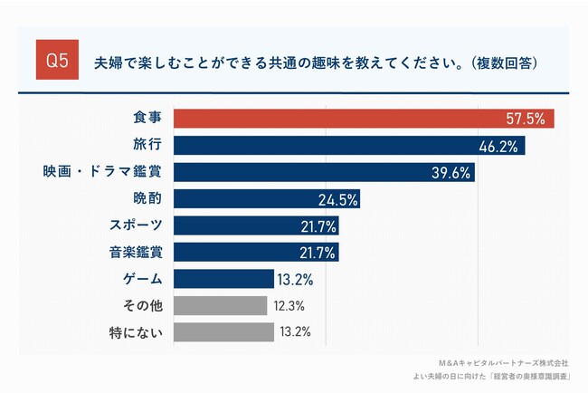 「Q5.夫婦で楽しむことができる共通の趣味を教えてください。(複数回答)」(n=106)と質問したところ、「食事」が57.5%、「旅行」が46.2%、「映画・ドラマ鑑賞」が39.6%という回答となりました。