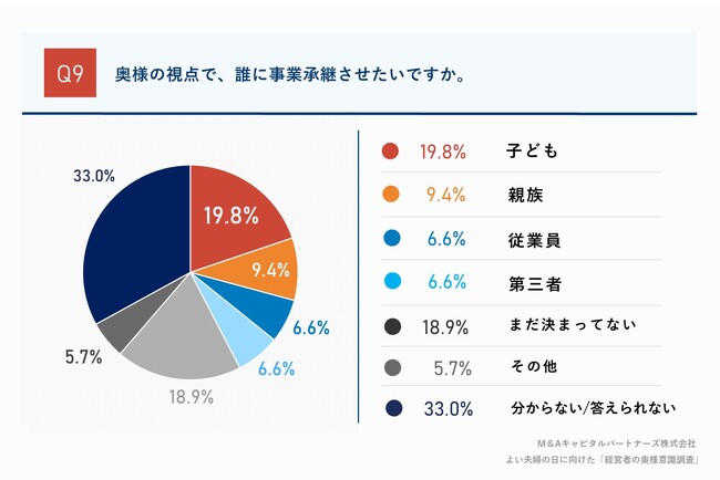 「Q9.奥様の視点で、誰に事業承継させたいですか。」(n=106)と質問したところ、「子ども」が19.8%、「親族」が9.4%という回答となりました。