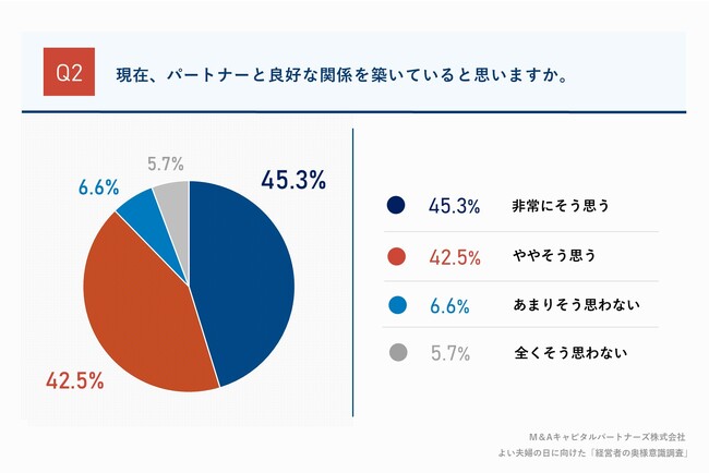 「Q2.現在、パートナーと良好な関係を築いていると思いますか。」(n=106)と質問したところ、「非常にそう思う」が45.3%、「ややそう思う」が42.5%という回答となりました。