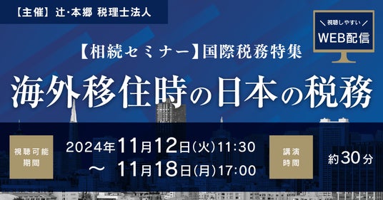 辻・本郷 税理士法人(本社:東京都新宿区、理事長:徳田孝司)は、2024年11月12日(火)より「【相続セミナー】国際税務特集 海外移住時の日本の税務」を開催いたします。所得税をはじめとする日本の税金の扱いについて、海外移住の前後では、特徴的な論点が多く存在し、ケースによっては納税の義務の範囲が変わります。本セミナーは海外移住時の日本の税務について、移住前後でおさえるべきポイントと注意点を詳しく解説します。