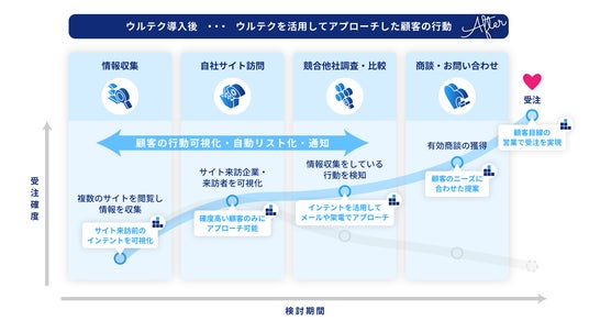 ウルテクはウェブサイト訪問者の企業情報と行動を分析し、”今”貴社を必要としている見込み顧客を自動的に特定します。