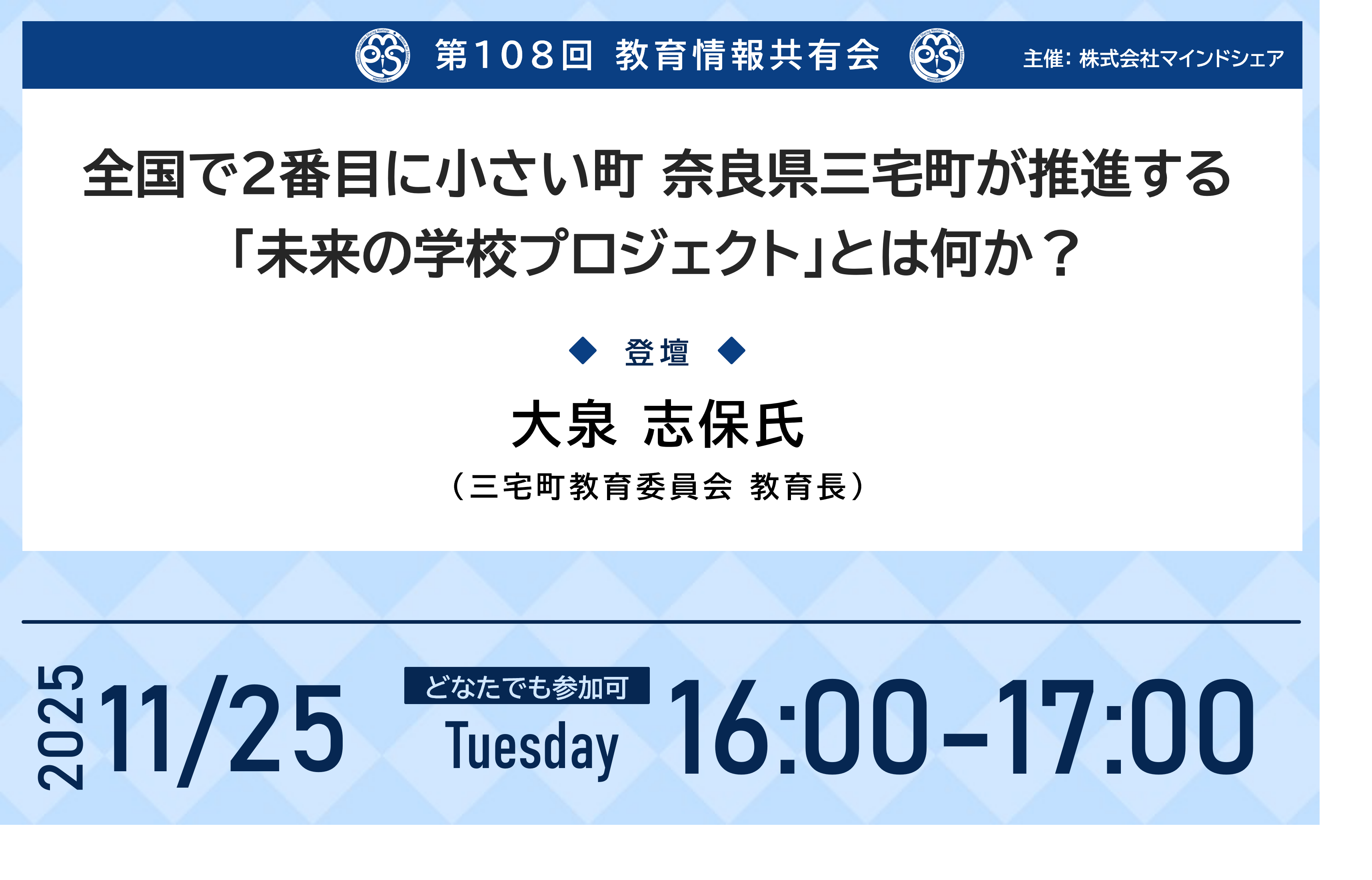 第108回となる今回は「全国で2番目に小さい町 奈良県三宅町が推進する『未来の学校プロジェクト』とは何か?」をテーマに、三宅町教育委員会 教育長の大泉志保氏をお迎えし、町独自の教育ビジョンや取り組みの背景についてお話しいただきます。