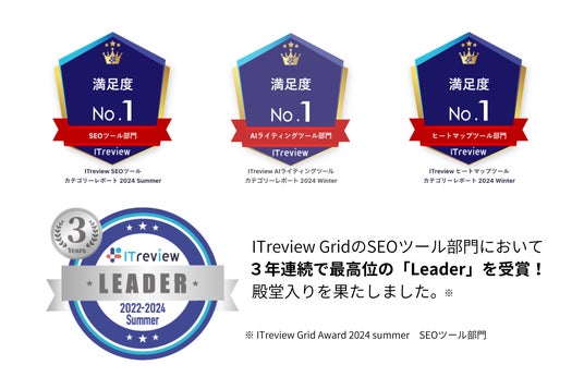 また、 ITreviewカテゴリーレポートでは3部門において満足度No.1(※1)をいただいております。さらに、ITreview Grid Award 2024 summerのSEOツール部門にて3年連続で認知度・満足度が共に高く評価されている製品の「Leader」を受賞(※2)し、殿堂入りを果たしました。