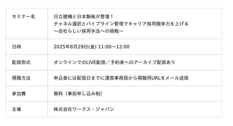 株式会社ワークス・ジャパン(本社:東京都千代田区、代表取締役:清水信一郎)は、2025年8月29日(金)に企業の人事担当者及び人材開発担当者を対象にしたオンラインフォーラム、WORKS REVIEW