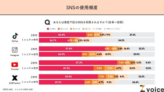 特にInstagramとYouTubeに関して「ほぼ毎日見る」と答えたZ世代は、ミレニアル世代に対して20ポイント以上多い回答となりました。