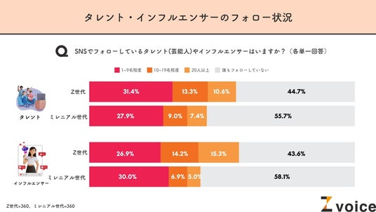 世代を問わず、フォローしている人数はタレント・インフルエンサーともに「1~9人」という回答が最も多かったものの、