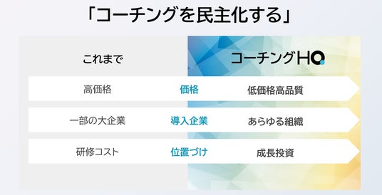 HQは、「低価格・高品質」で法人コーチングを提供することによって、あらゆる組織が「成長投資」として活用できる社会作り、すなわち「コーチングの民主化」を目指します。
