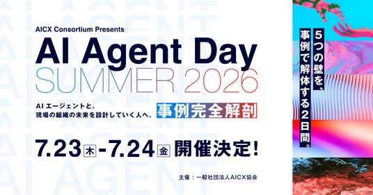 生成AI技術を活用したAIエージェントの社会実装を推進し、顧客体験(CX)の変革を目指す一般社団法人AICX(AI Customer Experience)協会(東京都、代表理事:小栗 伸、小澤 健祐、以下、AICX協会)は、AIエージェント活用の最前線を共有するカンファレンス「AI Agent Day 2026 Summer」を、2026年7月23日(木)・24日(金)の2日間にわたり開催します。