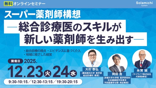 12月7日(日)に開催するリアルセミナー「スーパー薬剤師構想~総合診療医のスキルが新しい薬剤師を生み出す~ 」では、総合診療医養成の第一線に立つ大杉泰弘教授、薬局薬剤師による臨床研究・予防医療を牽引する岡田浩教授、全国初のヘルスケア複合施設「オールファーマシータウン」を創設した糸賀誠氏の3名が登壇。総合診療の視点、エビデンスに基づく薬局発の介入、地域に根ざした薬局経営という三つの観点から、これからの時代に必要とされる「スーパー薬剤師構想」について具体的にお話しします。