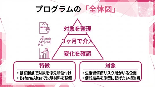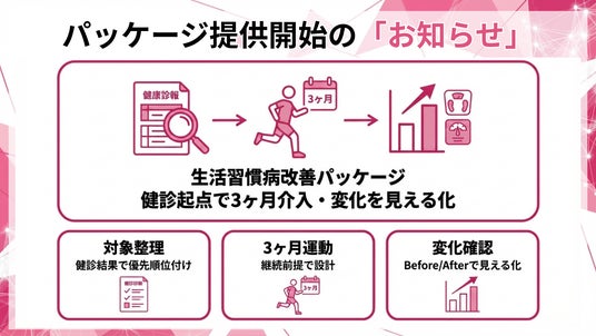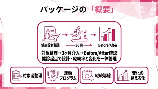 本パッケージは、健診結果をもとに企業が設定する対象(有所見者・予備群等)に対し、運動プログラムを