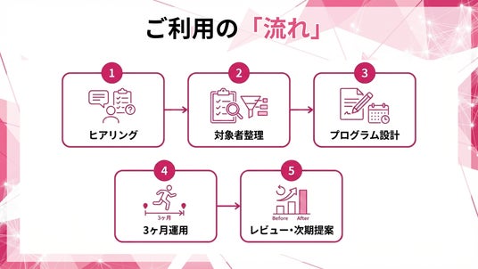 初回の情報交換では、対象者設計、運用導線、3ヶ月の実施パターン、確認項目の設計たたき台まで提示します。
