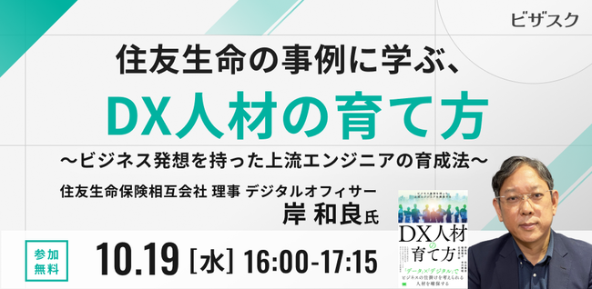 ~ビジネス発想を持った上流エンジニアの育成法~」をテーマに、「DX人材の育て方 ビジネス発想を持った上流エンジニアを養成する」の著者であり、住友生命保険相互会社 理事 デジタルオフィサーの岸 和良氏のご登壇による無料オンラインセミナーを、10/19/(水)16時より開催します。