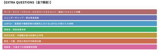 通常の認定で用いる100項目の「ダイバーシティスコア」に加え、具体的な実績や社内体制の整備状況を問う7項目の「EXTRA QUESTIONS(完全任意)」を合算し、ランキング形式で評価します。