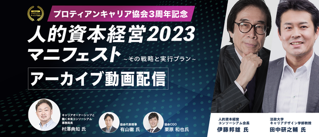 組織と個人のより良き関係性構築と個人の主体的なキャリア開発を支援する一般社団法人プロティアン・キャリア協会 (東京都新宿区、代表理事:田中研之輔・有山徹、以下、「当協会」)は、3月31日(金)に開催した3周年記念セミナー「人的資本経営2023マニフェスト~その戦略と実行プラン~」のアーカイブ動画配信の受付を開始いたします。