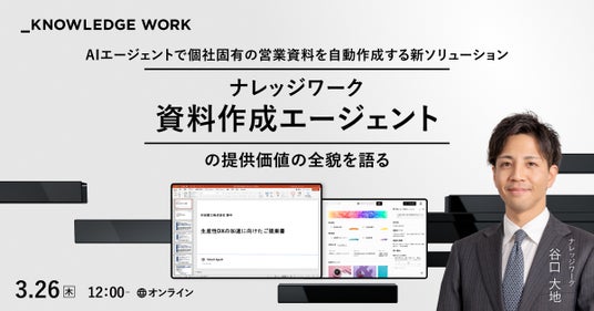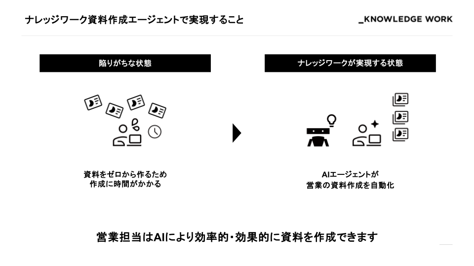 株式会社ナレッジワーク「LIFE WITH ENABLEMENT できる喜びが巡る日々を届ける」をミッションに掲げる株式会社ナレッジワーク(本社:東京都港区、CEO 麻野耕司)は、営業担当が日常的に作成する社内外の資料をAIエージェントが自動作成する新ソリューション「ナレッジワーク資料作成エージェント」の提供を開始しました。