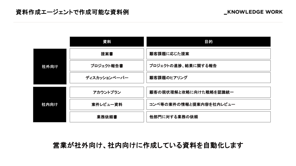 ◼️「ナレッジワーク資料作成エージェント」の具体例営業担当が日常的に作成する以下の資料の自動作成に対応しています。