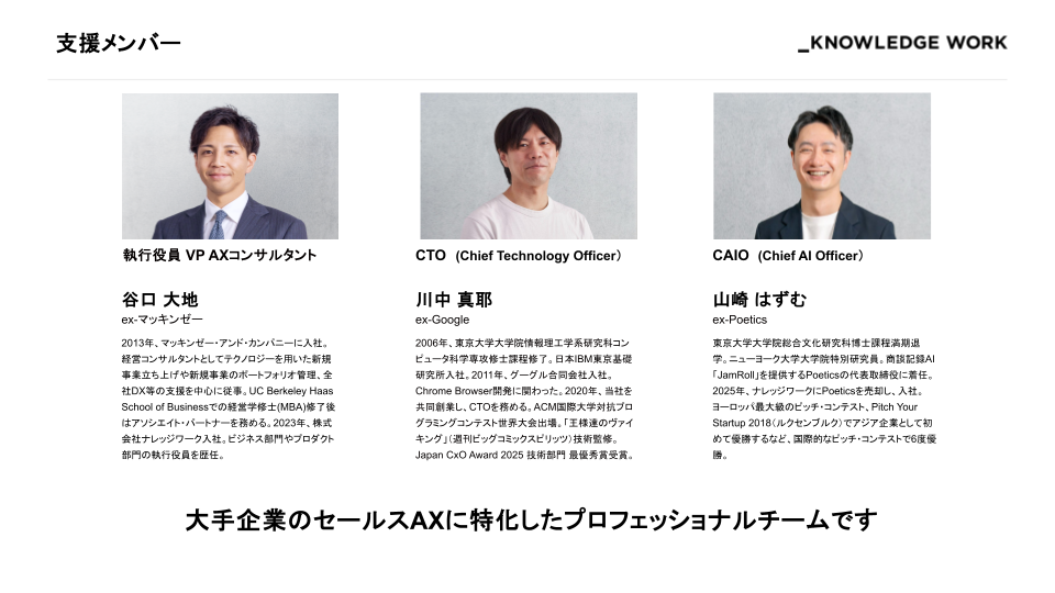 ◼️「ナレッジワーク資料作成エージェント」ご支援メンバー大手企業のセールスAXに特化した専門チームが伴走し、AIエージェントの設計から、実装・運用までをサポートします。