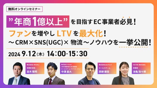 マーケティングアソシエーション株式会社の子会社であるHATME株式会社(本社:東京都台東区 代表取締役:中園広和、以下当社)は2024年9月12日(木)に、ウェブセミナー「”年商1億以上”を目指すEC事業者必見! ファンを増やしLTVを最大化!~CRM×SNS(UGC)×物流~ノウハウを一挙公開!」を、株式会社E-Grant、株式会社REGALI、株式会社はぴロジと共催いたします。